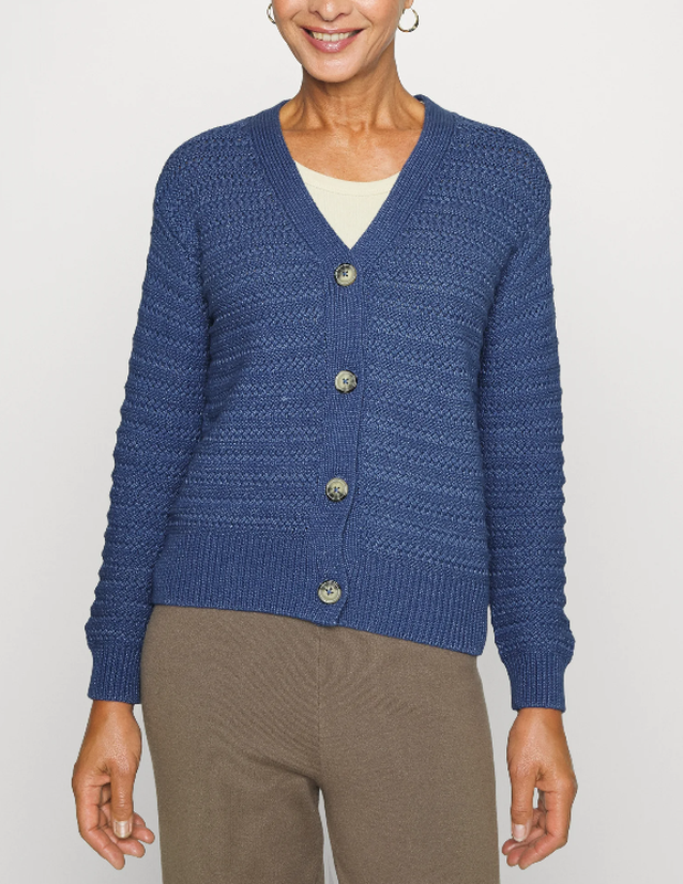 Замечательный женский кардиган M&S collection Мягкий, массивный, хлопковый трикотаж. Синий джинсовый цвет. Длина чуть ниже талии. Обычная посадка. V-образный вырез. Застежка на четыре пуговицы. 67% хлопок, 33% полиамид.