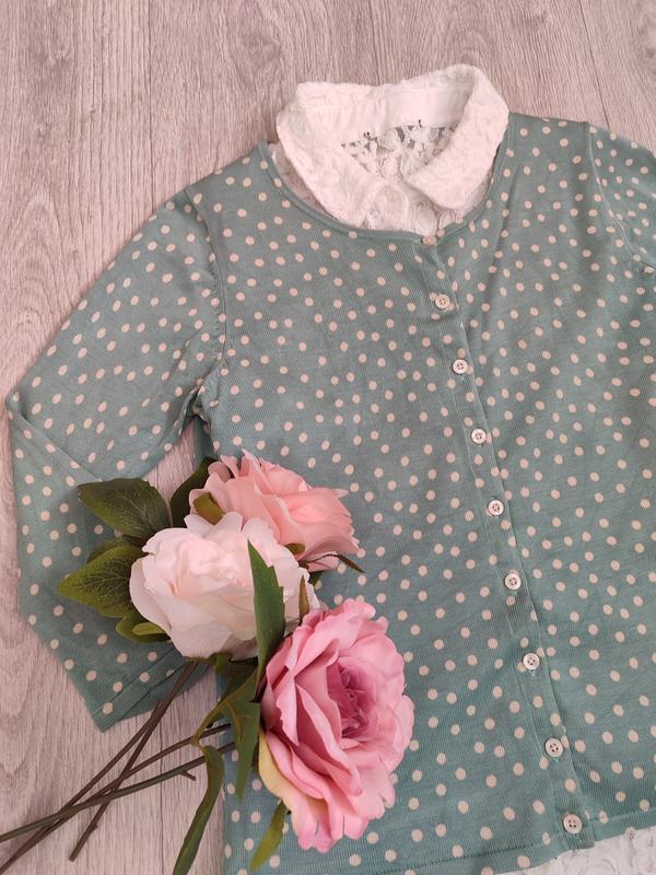 Дуже гарна вінтажна кофточка в горошок кольору Тіффані. В ідеальному стані. Гарна підкладка. На гудзичках. Тканина скоріше за все поліестер або акрил. Бірочки не має. Заміри пог 42см, довжина 53см, рукав 45см.