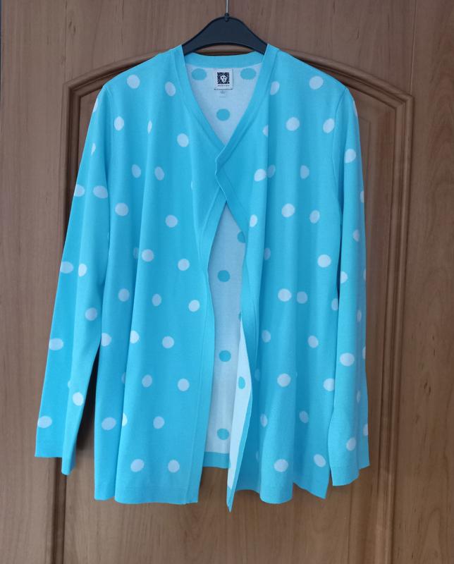 Кардиган в идеальном состоянии, размер L-XL голубого цвета с принтом в белый горох, нежный эластичный трикотаж, состав ткани - 61% полиэстер, 39% вискоза, замеры: плечи полуобхват - 37 грудь полуобхват - 50 бежевый полуобхват - 53 по низу - 57 длина - 68 длина рукава - 55 замеры выполнены по спинке, ширина одной передней полы - 35