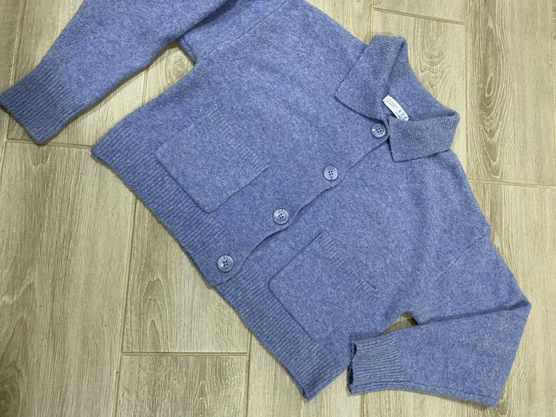 Укорочений кардиган Довжина -47см Груди напівобхват - 55см Рукав від шиї - 69 см Вказаний розмір S, підійде і на М. В гарному стані.