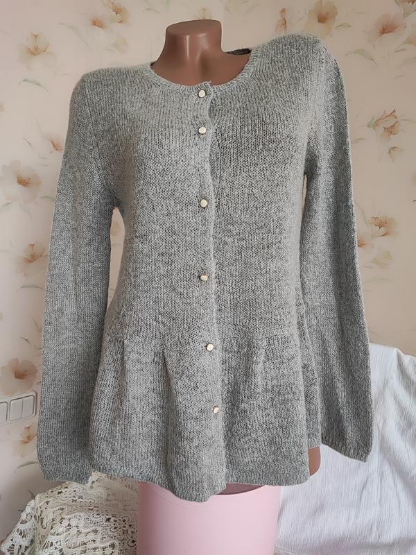 Нежный лёгкий кардиган светло-серого цвета. Приятный к телу, не кусается. Спереди на маленьких пуговичках, от линии талии широкая рюша. Смотрится очень эффектно. В плечах 36 см. Длина рукава от плеча 64 см. Состояние идеальное.