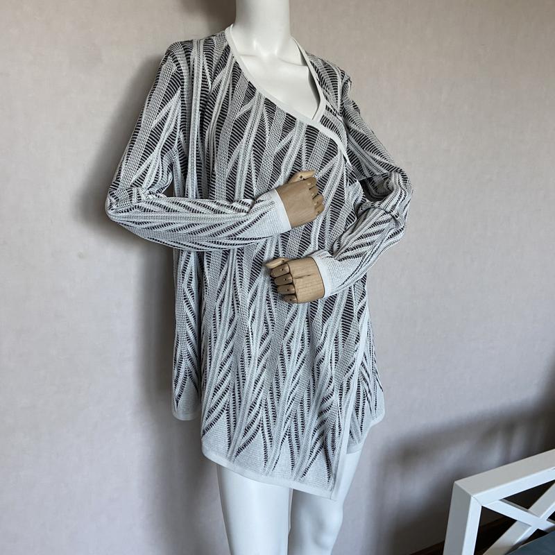 Размер: М + ткань красиво тянется Длина: 70 см Плечи: 38 см Рукав: 63 см Полуобхват груди: 49 см Состав: 70% вискоза, 29% шерсть, 1% нейлон Стан: 10/10 Носится свободно, пуговицами или кнопками не фиксируется