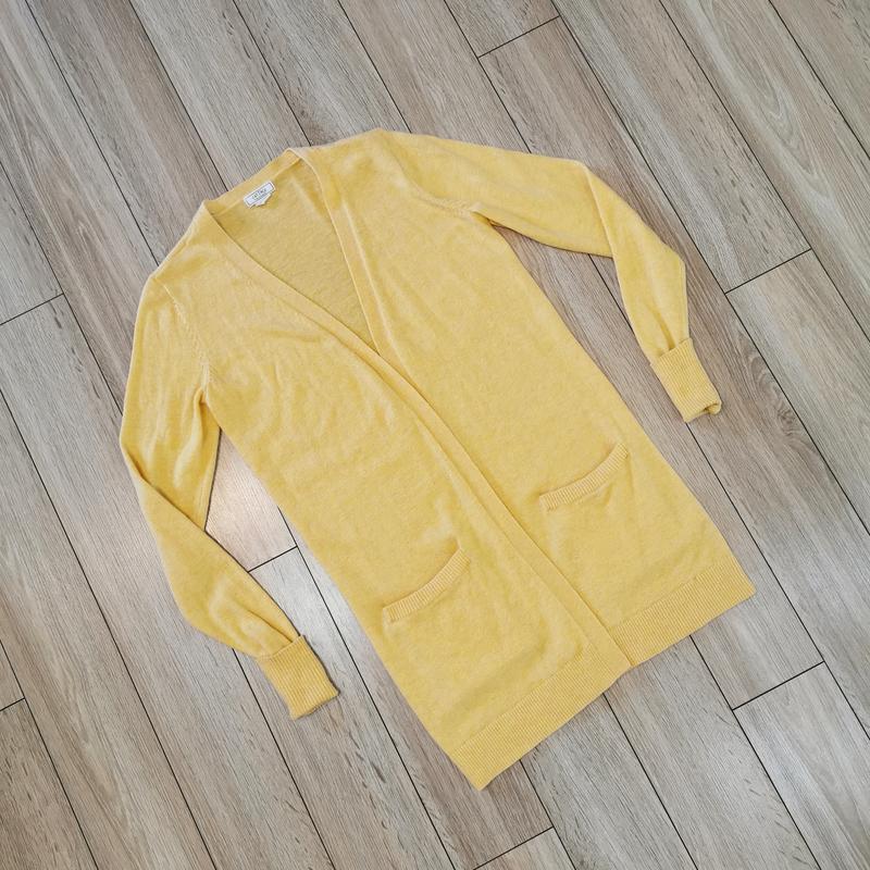 Кардиган без ґудзиків, подовжений, теплого жовтого кольору. В складі 65% вовни, 30% нейлон, 5% кашемір. Стан ідеальний. Заміри на останніх фото. По запиту додаткових скину в чаті. Можливий запах секонда.