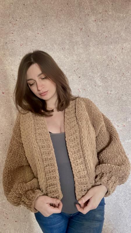 Вкорочений вʼязаний кардиган з плюшевої пряжі алізе пуффі файн . Мʼякий та теплий Під замовлення 5-7 днів Розміри від XS до L , а також дитячі від 74 до 158 Ціна залежить від розміру 1700-4000