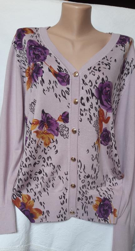 Весняна модель кофти на ґудзиках. ПОГ 55, довжина по спинці 63 см.Спинка однотонна, без малюнків( така як рукава)Фірма DALI.Гарна якість.У закупці була 20 доларів. Кофта з вітрини, тому я ії попрала. Але не ношена.
