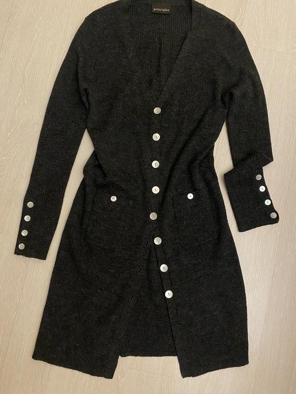 Сучасний темно сірий ,трикотажний кардиган. Оздоблення -перламутрові ґудзики .