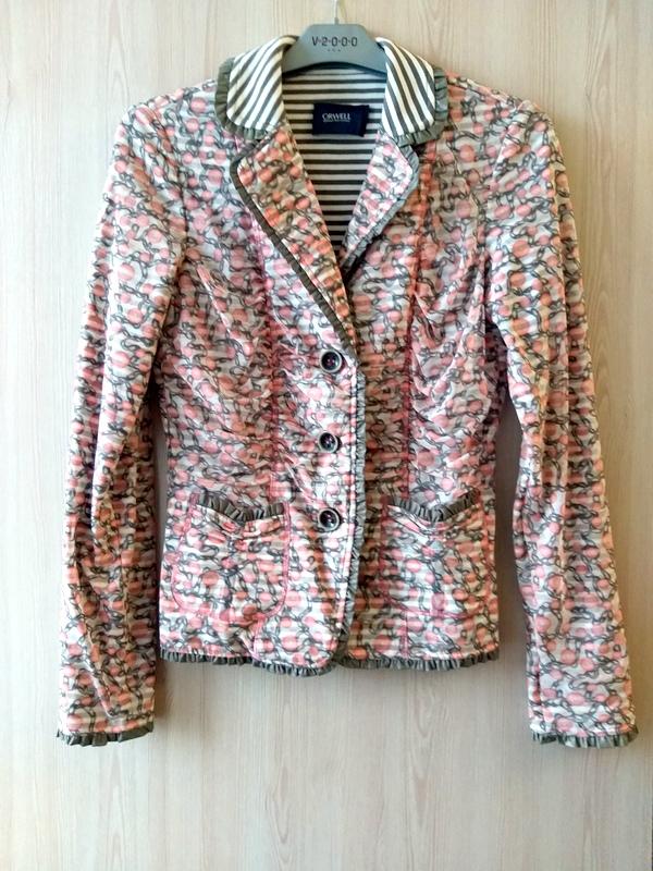 Трикотажный жакет от бренда Оrwell Selected Style. Жакет мягкий. Внутри подкладка трикотаж. Внешне очень хорошего качества сетка. Цвет нежно-розовый, с нежно-коричневым. На любой сезон. Хорошо тянется. Застегивается на ряд пуговиц. Кармашки с двух сторон. Воротник трикотажный. Рукав стандартной длины, можно подогнуть, тогда получается трикотажный манжет в полоску. По всему пиджачку края выполнены атласной лентой. Создавая при этом романтичный образ. ПОГ 40 см / ПОТ 36 см / ПОБ 38 см Длина - 55 см, Длина рукава - 60 см, Плече 10 см Ширина по плечах 38 см Состав: Хлопок / Эластан / Полиэстер Качество отличное. Эксклюзивная вещь, не массового производства. Идеальная посадка за счет трикотажной стрейч ткани. Выглядит очень презентабельно дорого. За счет сетки выглядит необычно. Причина продажи - не подходит по размеру.