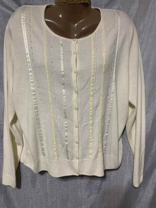 Кофта из мякого тонкого трикотажа, на пуговицах спереди. Замері: длина - 59см., плечи - 43см., рукав - 63див., ПОГ - 64см., ПОТ - 57см., ПОБ - 55см