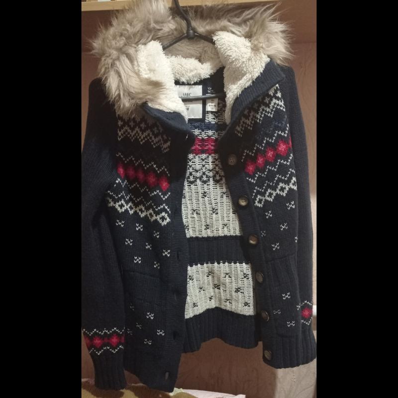 кофта теплая,гарного качества,в хорошем состоянии,катушек не видно,капюшон глубокий и утепленный, по телу идет двойная вязка,верхний материал 50% шерсть,30 акрил и 20 полиамид, замеры в фото,цвет темно синий