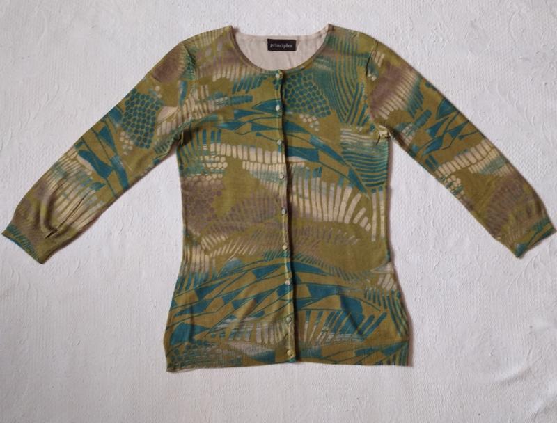Мягкая, приятная на ощупь кофточка. Состав: 80% вискоза, 17% нейлон, 3% эластан. Размер 42 / eur 36 / uk 8. Ширина плеч 36 см. ПОГ 40 см. ПОТ 36 см. ПОБ 42 см. Длина 58 см. Длина рукава 48 см.