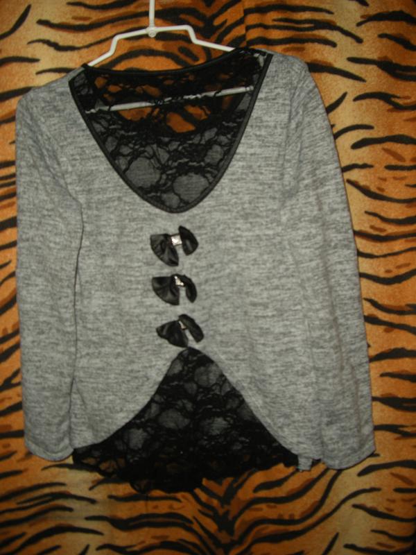 Шикарная ,фирменная,нарядная,стильная кофта светло-темно-серого цвета,вырез на шее обшит черного цвета лентой,сзади на спине красивые черные кружева выглядывают внизу кофты и в большом фигурном вырезе,по центру три шикарных бантика из черного цвета ленты с квадратиками из белых блестящих камушков,объем груди-96см.,рукав длиной-58см.подстегивается на пуговицу,длина-64см.