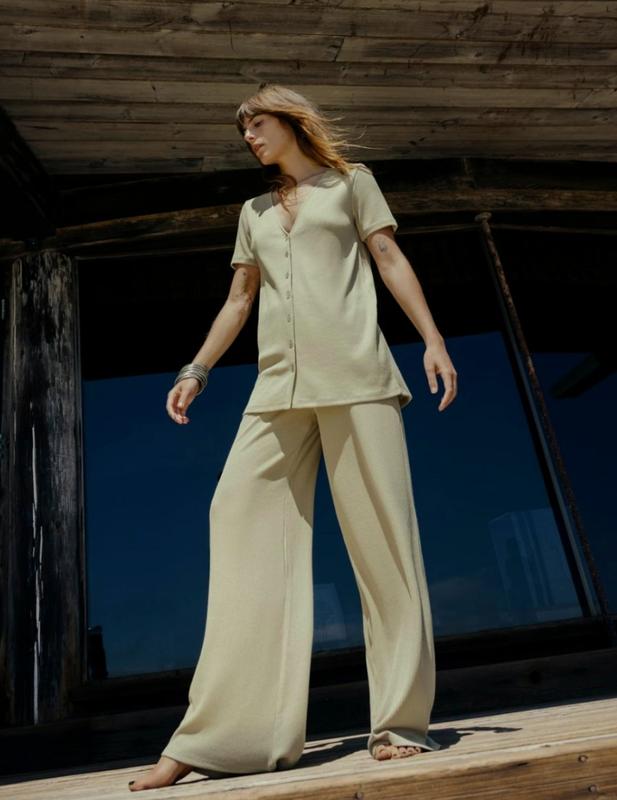 Кардиган в рубчик с треугольным вырезом на пуговицах. Состав: 49% полиэстер, 49% вискоза, 2% эластан. Плечи - 39 см ПOГ - 43 см ПOТ - 44 см Рукав - 19 см Длина - 70 см