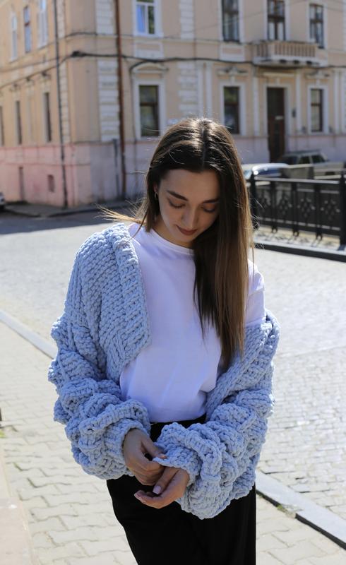 Вкорочений кардиган ручної роботи Виконаний із гіпоалергенної мʼякої пряжі Терміни виготовлення: 3-4 дні Можливий повтор у інших кольорах