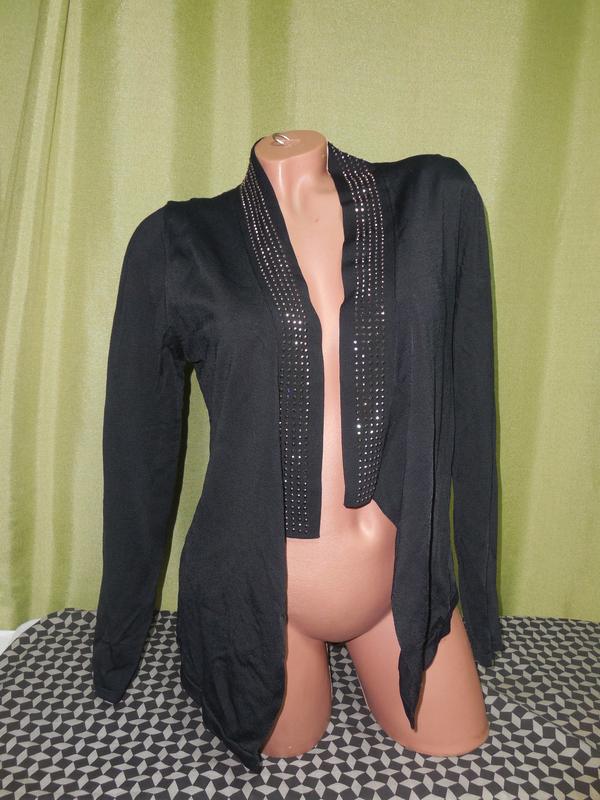 Нарядная кофта кардиган размер указан 38, 10 подойдет на 44- 46-48-50, т.к. без застежки Длина по спинке 55 см., впереди низ неровный, чуть длиннееЮ до 70 см. ширина под рукавами - 49 см. рукав 662 см.