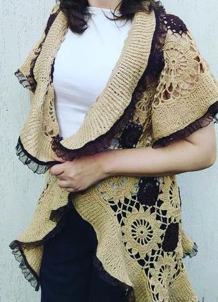 Ажурный капдига в бежево-щеколадных тонах, связанный из мотивов и отделанный лентой рюш. Выполнено крючком цветочными мотивами. Нити полушерсть... такое себе ажурная тучка. размер 46-48. (34-38)