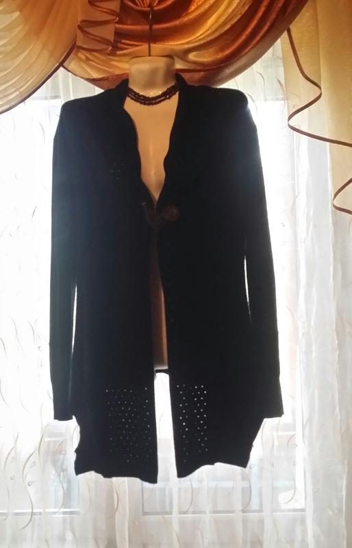 Красивый черный кардиган. Размер заявлен S/ М, но идет на М.(смотрите по замерам). Хорошо сядет на 10-14 размеры, (не сток). Покупала в разы дороже. Состояние очень хорошее. Прямого свободного кроя.На запах, без застежек. Передние полочки удлиненные, по низу ровные. С перфорацией по шальке. Спинка ровная, укороченная, с диагональным рисунком. Тянется. 40% полиамид, 20% вискоза, 20% модал, 10% полиэстер, 10% эластан. Плечики: 43 см. Рукав: 64 см. ПОГ: 50 см. Длина впереди: 85 см. Длина по спинки без стоечки: 60 см. Отвечу на Ваши вопросы.