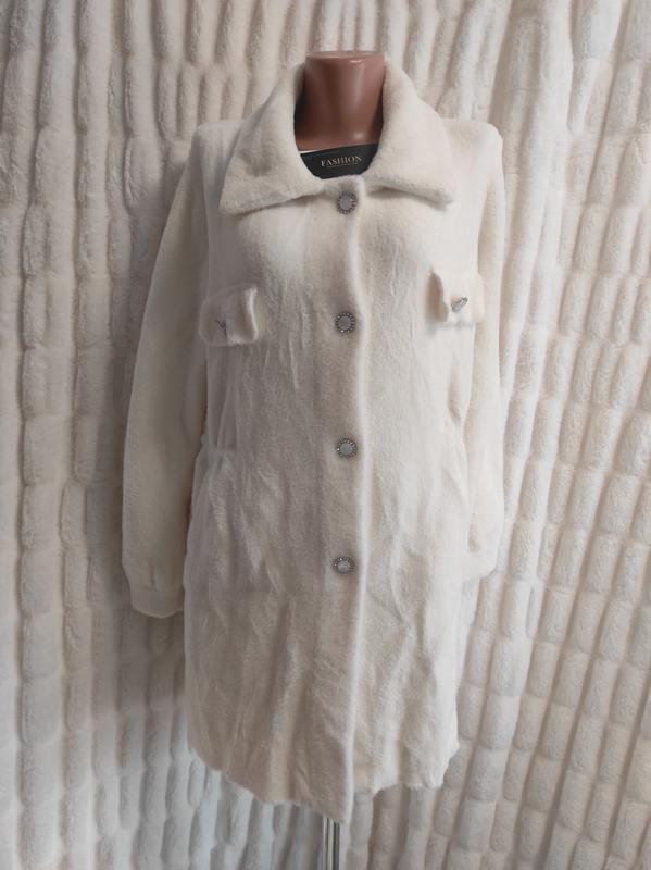 Женская кофта-кардиган с длинным рукавом. Ткань - очень приятная на ощупь, мягкая и уютная. Цвет молочный Два кармана. Застежка - пуговицы. Ориентировочные замеры по готовому изделию: Полуобхват груди - 52 см Длина рукава - 55,5 см Длина изделия по спине - 77,5 см Полуобхват низа - 58 см Бирки со складом ткани отсутствуют на изделии