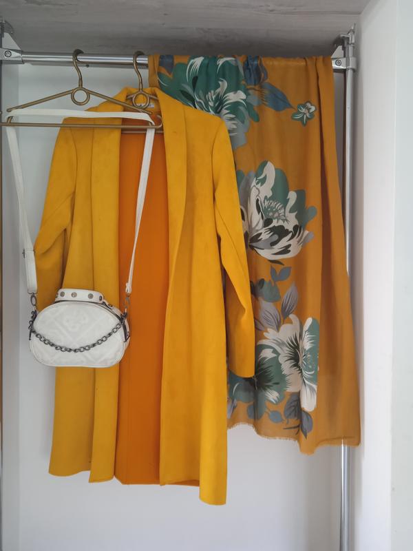 Классический однотонный кардиган с длинным рукавом насыщено желтого цвета. Легкий и комфортный. Приятный на ощупь. Плотная плотная ткань (похожая на искусственную замшу). Стрейч. Фасон прямой. Ложится свободно. Без застежки Имеются скрытые карманы по бокам. Стильно смотрится с шарфом в тон в комплекте (шарф может быть заменен, но в цвете). Есть размеры.