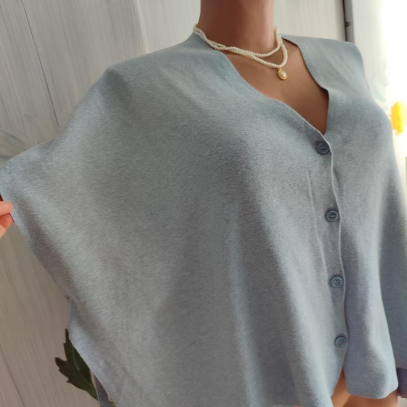Самодостаточный красивый кардиган, нежно голубого цвета. В очень хорошем состоянии. На завязках. Коттон. Замеры пог 50-53см, длина 55см.