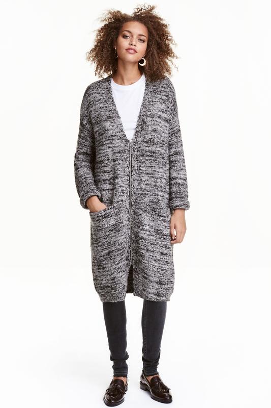Кардиган грубой вязки из мягкой меланжевой пряжи, широкий силуэт. Треугольный вырез с молнией и карманами спереди. Заниженная линия плеча и длинные рукава. Размер XS, eur34, (наш 40) на ОГ-80см, ОТ-64см, ОБ-88см. На рост 160см. Новый, без дефектов. Повреждена внутренняя бирка.