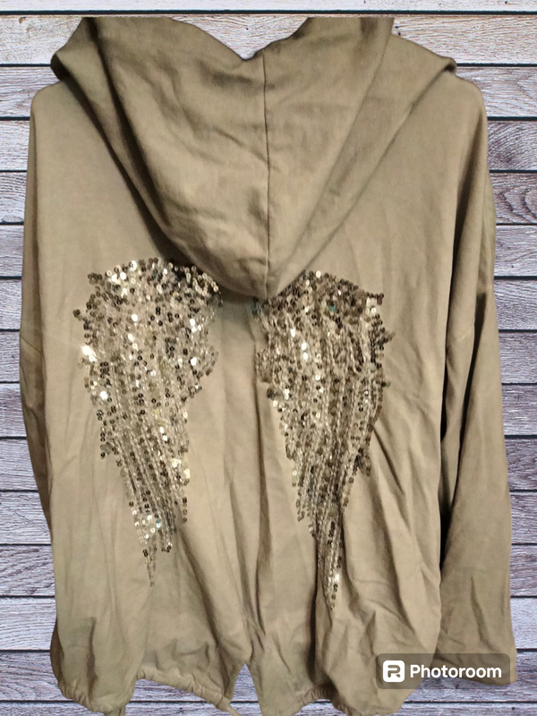 Перед структурированный лен,рукава и спинка хлопок/вискоза, глубокий капюшон,два прорезных кармана, низ кулиска,декор пайетки. ПОГ 57 Д 64