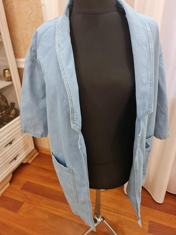 джинсовый кардиган р.54-56, ОГ112, ОБ 116, длина 87, рукав 3/4 от плеча 60