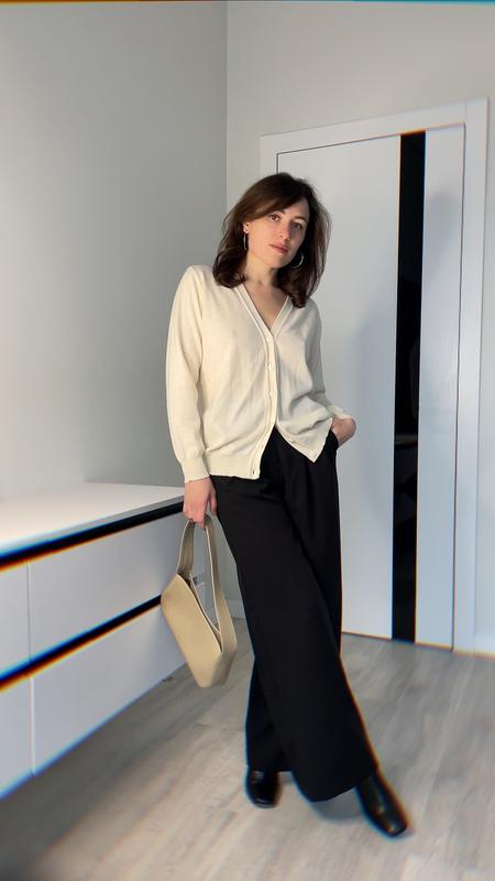 Молочный кардиган на пуговицах. Подойдет на девушку, которая носит xs-s размер одежды. Состав кардиган а очень хорош (фото добавила).