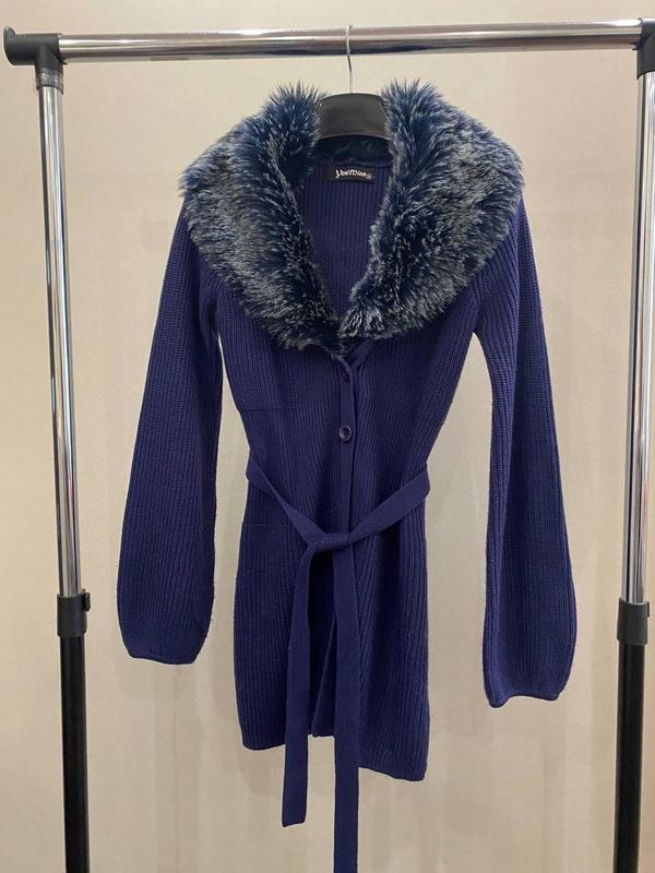 Кардиган В дуже гарному стані Вʼязаний , теплий, тягнеться Хутро штучне ( можно відстібнути) Розмір С-М Рукав від горла-78 Довжина-78 ОГ-45 От-40 Ос-45 150 гр