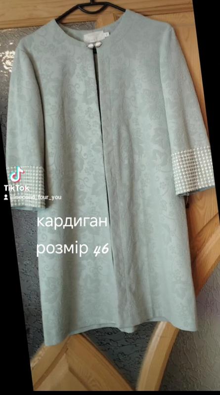 прикольный кардиган с выбитым по нему узором, отлично подходит как к брюкам так к платью