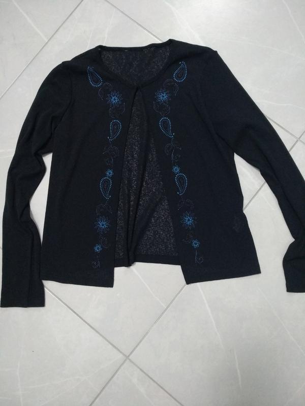 кофта кардиган отделана вышивкой из бисера. Застегивается на крючок. Длина 55 см. Полуобъем в груди 48 см. Длина рукава 62 см. Ширина по плечам 38 см.