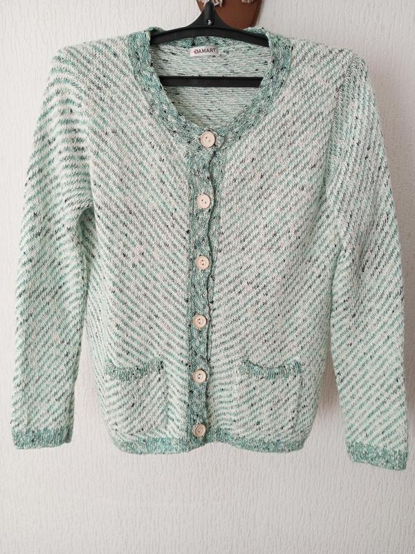 очень изысканная и стильная кофточка на пуговицах с кармашками спереди полуофат груди 47 длина60 рукав 64 плечи 39 состояние отличное по бирке размер S