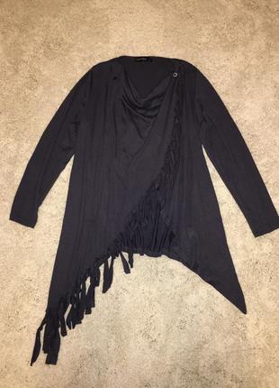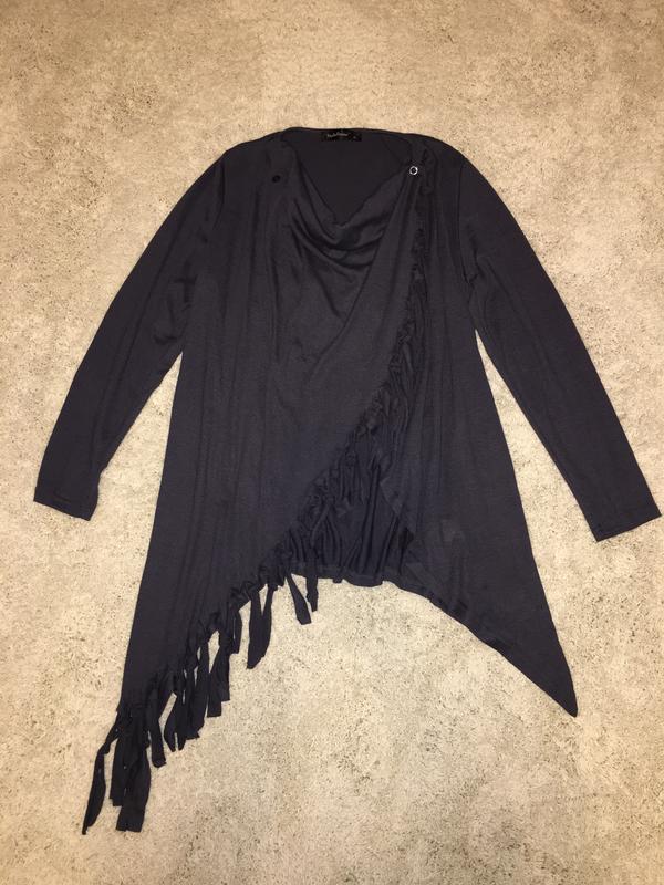 Красивий кардиган сірого кольору. Зверху защипається на два гудзика. Тканина дуже мягенька, приємна до тіла. На бірці розмір XL. Заміри у вільному стані, тканина добре тягнеться: Плечі - 41 см Довжина рукава - 60 см Пог - 55 см Довжина по спині - 70 см Найдовша довжина - 89 см + 11 см декор