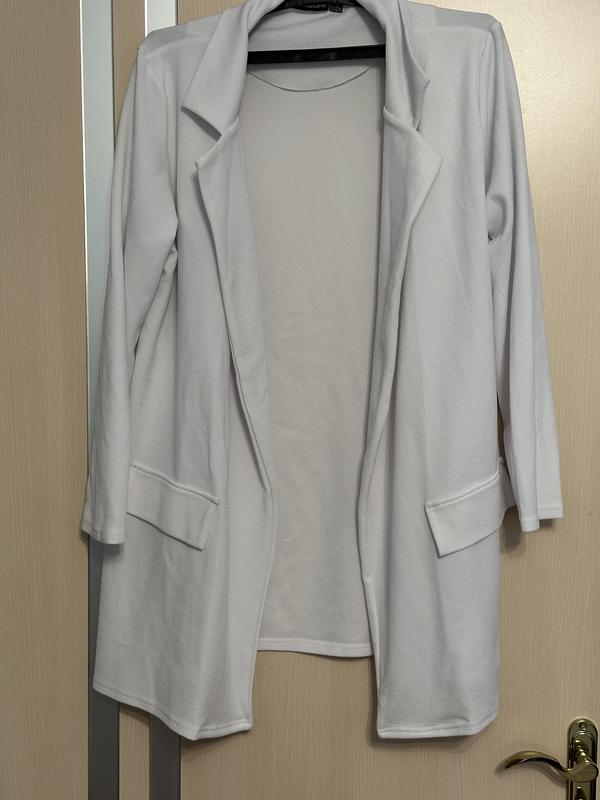 Кардиган білого кольору без паска. Підійде на груди до 125см. Довжина-80см. Довжина рукава від плеча- 60см. На бірці вказаний 18 розмір.