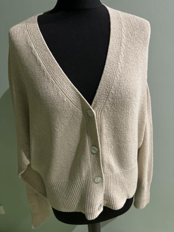Кардиган Н&M,размер Л Замеры:длина 54 см,п.обьем груди 70 см, п.обьем по низу 53 сс, длина рукава от воротника 74 см.Цвет беж. Состав на фото.