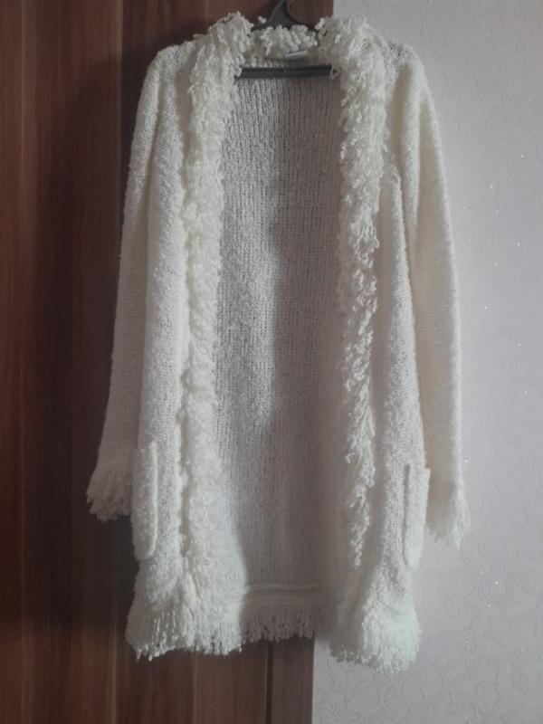 Кардіган махеровий молочного кольору. з карманами. стан ідеальний. Тягнеться але небагато.Одягався два рази. Теплий та мягенький. Виглядає просто бомбезно. Придбаний за кордоном. Довжина 102 см.Довжина рукава від плеча 60см Застібається на три маленькі гачечки. Прошу зауважити. Секондом не займаюсь.Всі речі особисто мої власні. До уваги. Повернення немає. Працюю тільки з оплатою Продавцю на карту. Відправлю Укрпошта Нова пошта. Перед замовленням уточнюйте наявність.