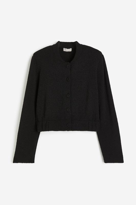 Цена 2670 Пиджак из фактурного трикотажа с тонким ребристым воротником и закрытыми пуговицами спереди. Модель свободного кроя с подплечниками и закрытой резинкой на подоле. Артикул: 1207765001 HM