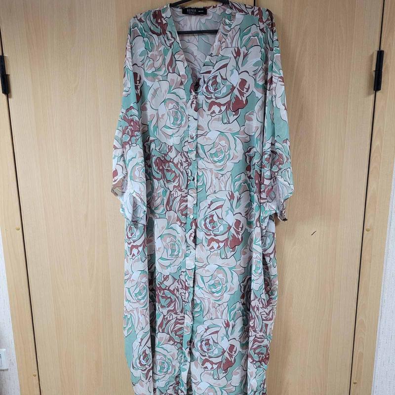 Длинный кардиган-блуза большого размера, шифон, рукав спущеный. Новый, без бумажной этикетки, люкс сток.Обхват 170, рукав от ворота 55, длина 127.