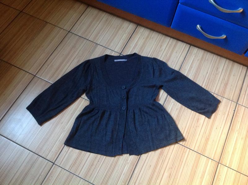 Жіночий Кардиган на трьох гудзиках.Колір на фото спотворюється,ближче до оригіналу колір на 3,4 фото.Рукав 3/4.Можна красиво комбінувати з блузками або з облягаючими речами.Колір:темно-сірий меланж.В'язання-гладкий трикотаж,горловина і талія оброблені вставками в "рубчик",по лінії талії злегка присобран (фото 2).ПОГ 41.5 см,ПОТ 35 см,довжина рукава від шиї 50 см,довжина виробу по спині 56 див. Дивіться мої інші оголошення.