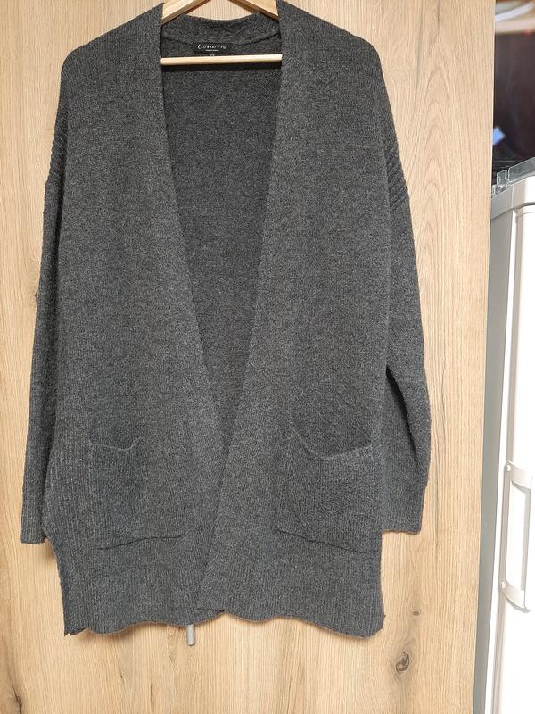 Стильный и удобный кардиган без застежек, хорошо тянется, размер 16., и можно надевать с 12 по 20. Длина 85см.