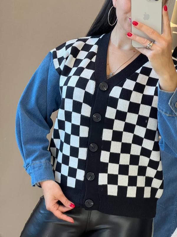 невероятно красивый и стильный кардиган, свободного кроя на резинке внизу и пуговицах спереди, будет отлично смотреться на вас в офисе, вечеринке с друзьями и в повседневной жизни, он изготовлен из яркого и оригинального сочетания двух тканей: трикотажа машинной вязки высокого качества, декорированного модной клеткой, и темно-синего денима на рукавах с манжетами, которые застегиваются на пуговицы кардиган хорошо подходит девушкам с разными типами фигур и легко комбинируется с одеждой разных цветов и стилей размер единственный 44-46 длина 59-60 см, объем груди по изделию 106-108 см, длина рукава от шеи 67-68 см код 0596