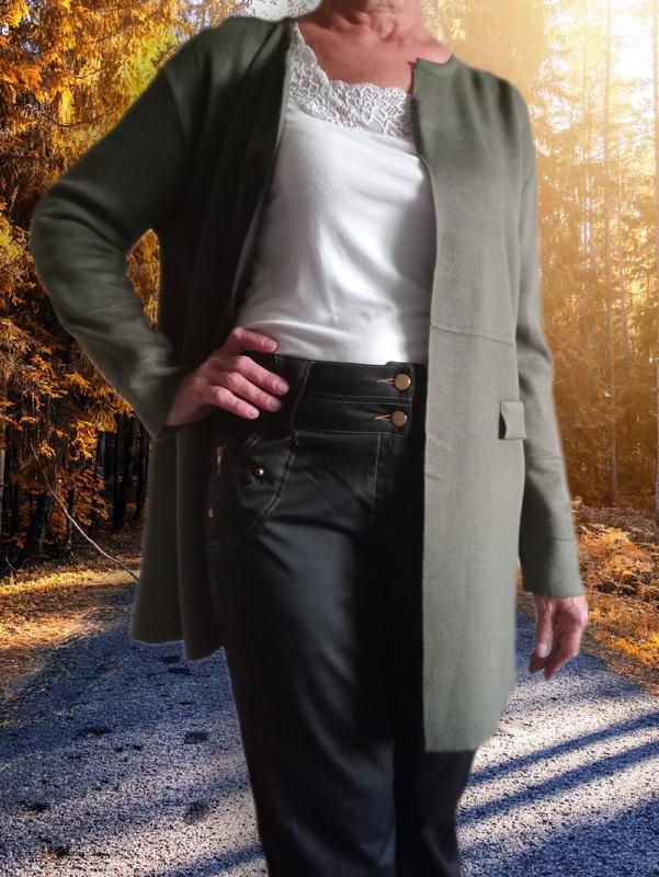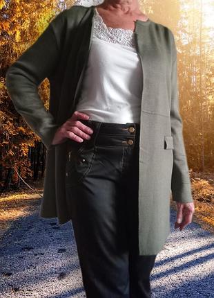 Вязаный женский кардиган, производство Турция. Модель свободного силуэта из полушерстяной пряжи цвета хаки или ламинарией. Вырез горловины круглый, приспущенная линия плеча, втачной длинный рукав. Спереди по бокам накладные карманы-имитация. Изделие без застёжки, но можно использовать брошь или декоративную булавку для соединения двух полочек. Кардиган универсальный, его можно сочетать как с классическими брюками, так и с джинсами, юбками или платьями., незаменимая вещь в прохладную осенне-весеннюю погоду. Этикетка оторвалась, вещь новая не ношенная, без дефектов. ☘️Основные замеры: на размер 58 ПОГ-58см ПОБ-58см Длина изделия-78см Длина рукава от плеча-58см. Обхват рукава по пройме-46см Обхват рукава по низу-26см Длина плеча -16см Ширина спины-53см.☘️ 👗Все вещи новые это не сток.Товар на распродаже после закрытия магазина. Смотрите мои другие объявления. ❤️ Подписывайтесь. Приятных покупок.🎁