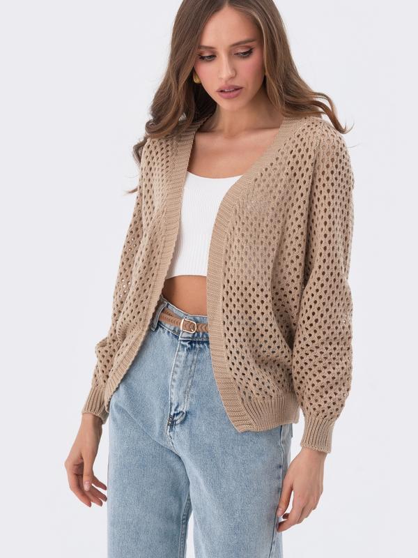 🌸Прогулянковий кардиган ажурної в'язки. Манжети та низ зв'язані гумкою. Модель без застібки. ✔Розмір:42-44,46-48, 50-52 🪡довжина по спинці – 64 см 🪡довжина рукава – 60 см. 🧵Склад: 80% бавовна, 20% поліестер 🎨Колір: блакитний,молочний, бежевий 🧵Матеріал: Бавовна 💰ціна 1250грн Арт24307 ‼️Кількість обмежена