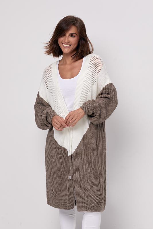 Кардиган женский вязаный, длинный, на пуговицах, батал, плюс сайз, молочный - кофейный