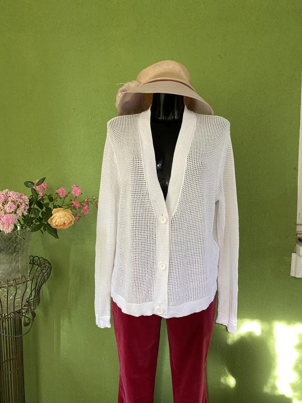 Замечательный кардиган белого цвета от Madeleine. Склад:бавовна-100/. Актуальная модель. Размер по набору 44/46. Замеры: длина-64 см, ПОГ-54 см, ПОБ-52 см, рукав65 см.