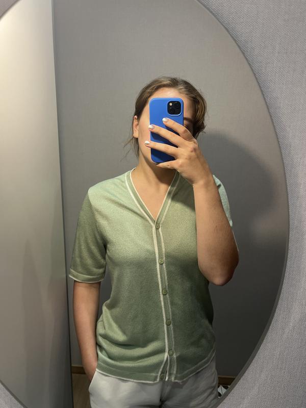 світло-зелена кофтинка на ґудзиках з дуже приємної легкої тканини. довжина 67, ширина 51, рукав 28. підійде на м/л