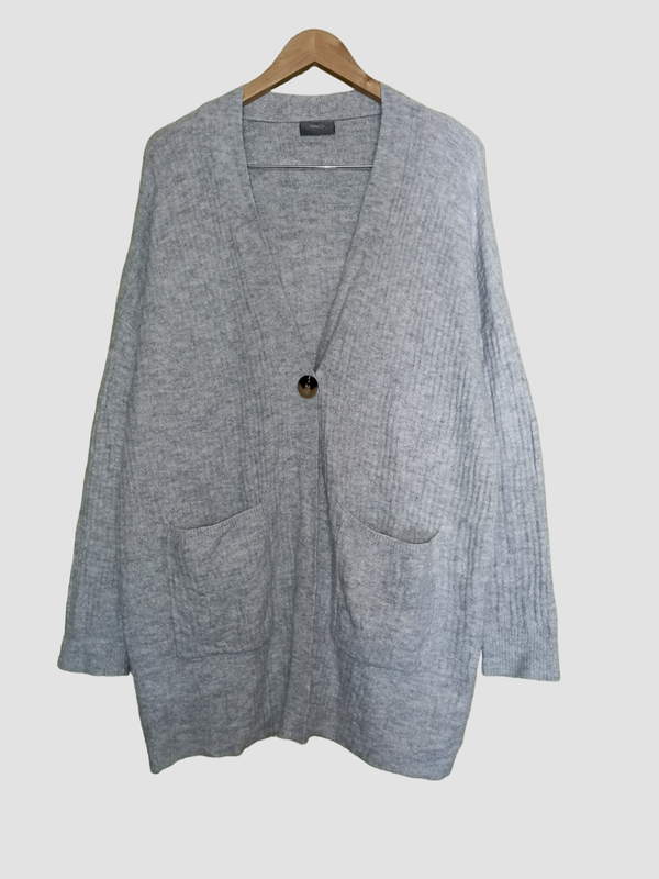 Классный тёплый кардиган, в составе есть шерсть. Структурный плотный трикотаж в широкий рубчик средней плотности. Размер L, что соответствует 44 євро. Длина 87 ПОГ 65 длина рукава от горловины 80