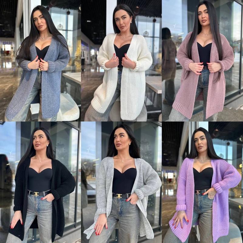 Кардиган Модель вільного крою, оверсайз Склад: напіввовна Ціна 755 грн Розмір універсал 44-56 Кольори: молоко, темна пудра, джинс, бузок, чорний, сірий - довжина виробу 80 см - довжина рукава від горловини 73 см