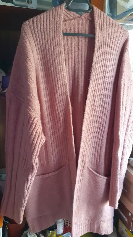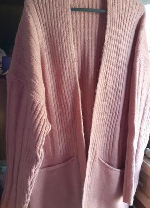 Суперовый кардиган,стильная,крупная вязка,очень очень тянеться,бирки с составом не было при покупке,только бумажная,похоже на кошемир,нить с мелким пушком,мягенький приятный к телу,тёпленький,одевался один раз,на меня стал большой,состояние новой вещи.замеры пол.гр.60++++++,длинна 82,плечи приспущены.цвет пудра.