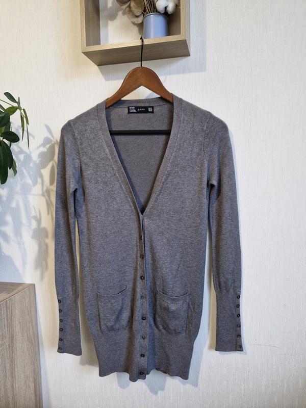 Кардиган Zara Размер М Полуобхват груди - 40 см Полу обхват талии - 38 см Длина рукава - 63 см Длина по спинке - 72 см Очень мягкий. Имеет маленькую дирочку на плече. Добавлено фото.