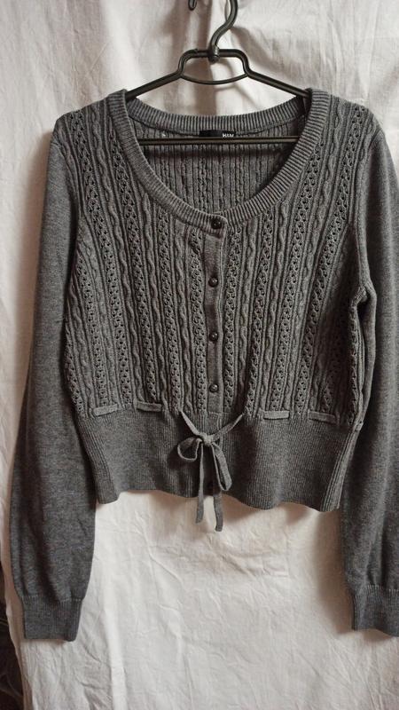 Укороченный кардиган серого цвета ажурной вязки. Подойдет на размер М- L. Ширина под рукавами 50 см, длина 50 см, длина рукава 63 см. Продажа по полной оплапе на карту.